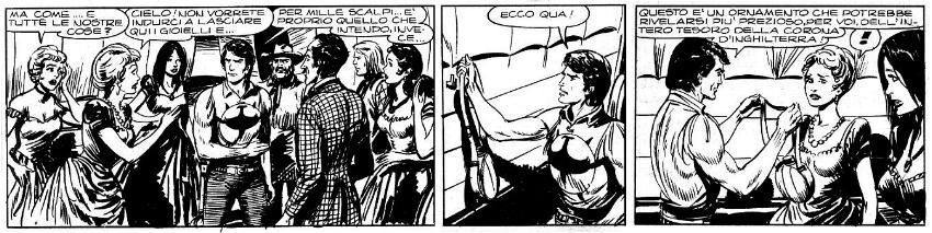 – Quando una nobildonna si lamenta del dover abbandonare i propri gioielli per poter fuggire senza inutili appesantimenti, Zagor le mette al collo una borraccia sfoggiando un dialogo di efficacia fulminante: