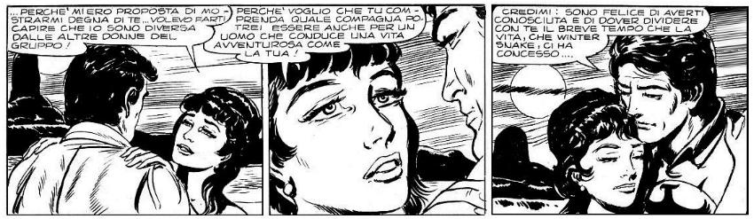 Pur in un contesto drammatico, tra lei e Zagor nasce una reciproca attrazione che culmina nella scena romantica sull'isolotto.