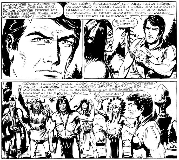 – Durante l'assalto dei Kiowas assistiamo al tormento interiore di Zagor, costretto suo malgrado a sparare su coloro che rappresentano la parte lesa del conflitto in corso. Le sue sono riflessioni tutt'altro che banali; è raro infatti che un eroe venga calato in una situazione non manichea (coi buoni da una parte e i cattivi dall'altra), e ancor più raro che si ritrovi a dover prendere le difese della fazione in torto.