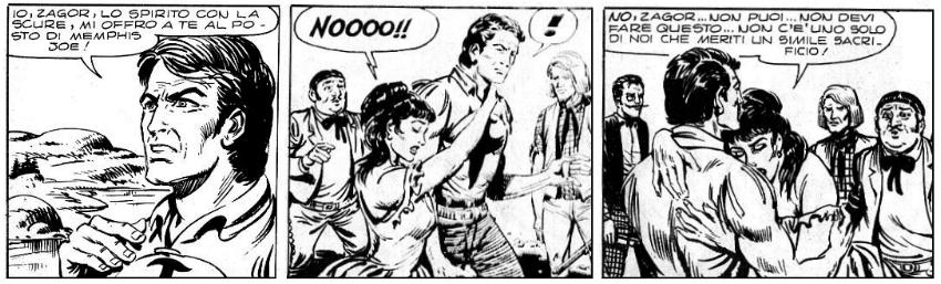 Conta chi scrive, come scrive, ma anche chi disegna e come disegna. Tanto per fare un po' di polemica, Joevito Nuccio cura molto i dettagli ma il suo Zagor per me continua ad essere quai sempre troppo tirato e musone, dunque lontano da quello di Ferri che invece gli dava ogni tipo di espressione. Era anche grazie a questo che lo sceneggiatore poteva cacciarlo in situazioni simili: